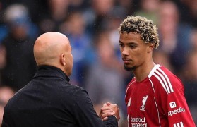 利物浦主帅阿尔内・斯洛特在与球员雨果・埃...
